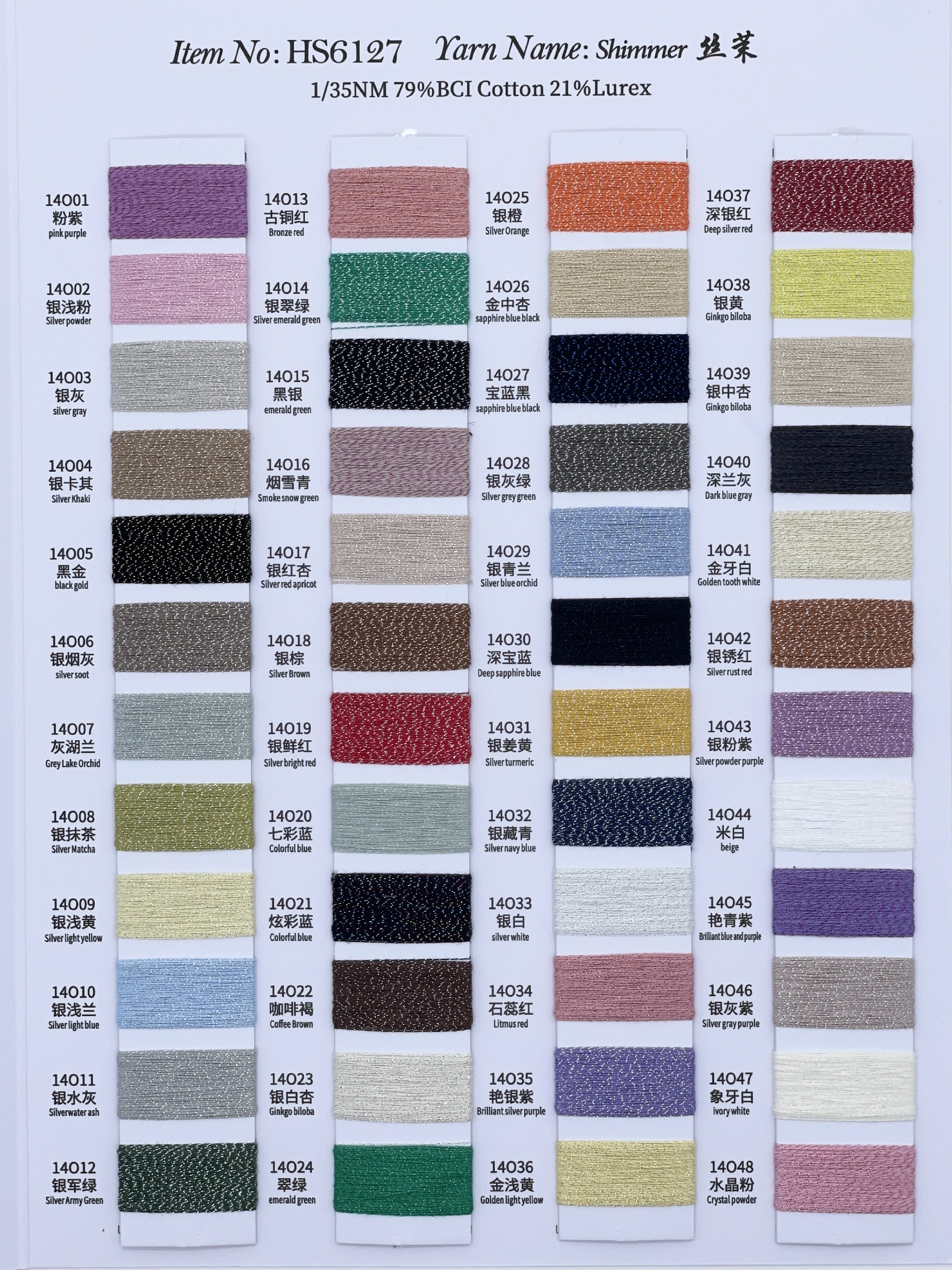 1/35NM 79%Cotton 棉(Recycled/0nganic /Bci)21%Lurex 金银丝 shimmer 丝茉 HS6127